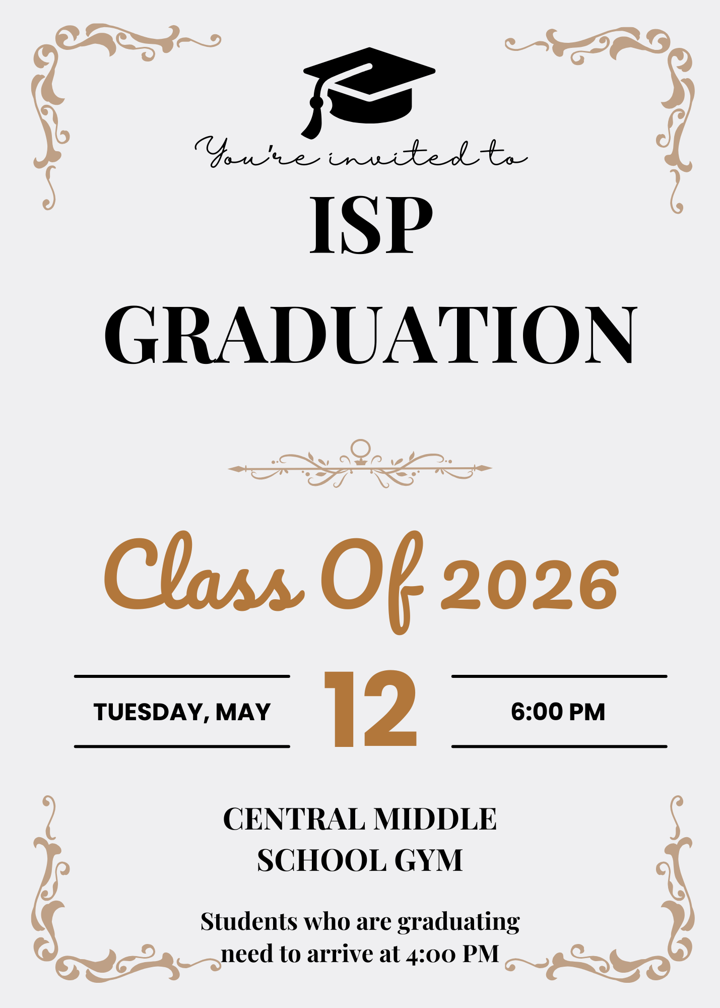 Graduation ceremonies for students who have completed the ISP program during the 2025-2026 year will be held on Tuesday, May 12, 2026, at 6:00 p.m. in the Gym at Central Middle School in Wartburg.